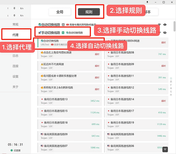 大的【自动切换线路】是不能选择的,只能在【手动切换线路】里面选小的【自动切换线路】,大的【自动切换线路】节点才会生效。