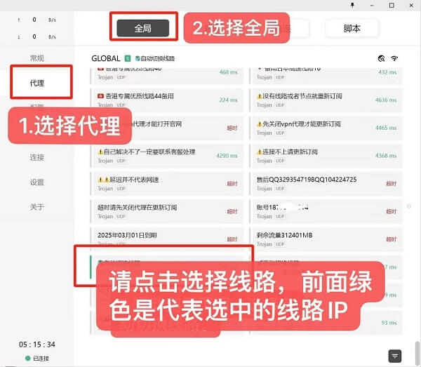 全局模式需要在GLOBAL【节点选项】:点击选择线路。